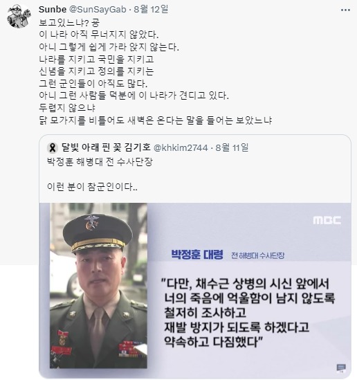 1. 박 대령은 “사건 발생 초기 윤 대통령께서 엄정하고 철저하게 수사해 이런 일이 재발하지 않도록 하라고 지시하셨고, 저는 대통령의 지시를 적극 받들었다”고 했다.